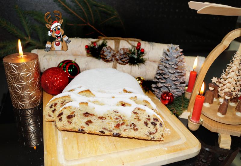 Zutaten: Stollenmehl(WEIZENMEHL) Typ 405, Sultaninen, BUTTER, BUTTERSCHMALZ, Pflanzliches Fett (Palm,Kokos,Raps), Schweineschmalz, MANDELN, bittere MANDELN, Zucker, Zitronenschalenpaste, Orangenschalenpaste, Puderzucker, Dekorpuder (Traubenzucker,WEIZENSTÄRKE), Glukose-Fruktose-Sirup, Orangeat, Zitronat, Backhefe, natürliche Aromen, Jamaica-Rum/Alkohol, Salz
